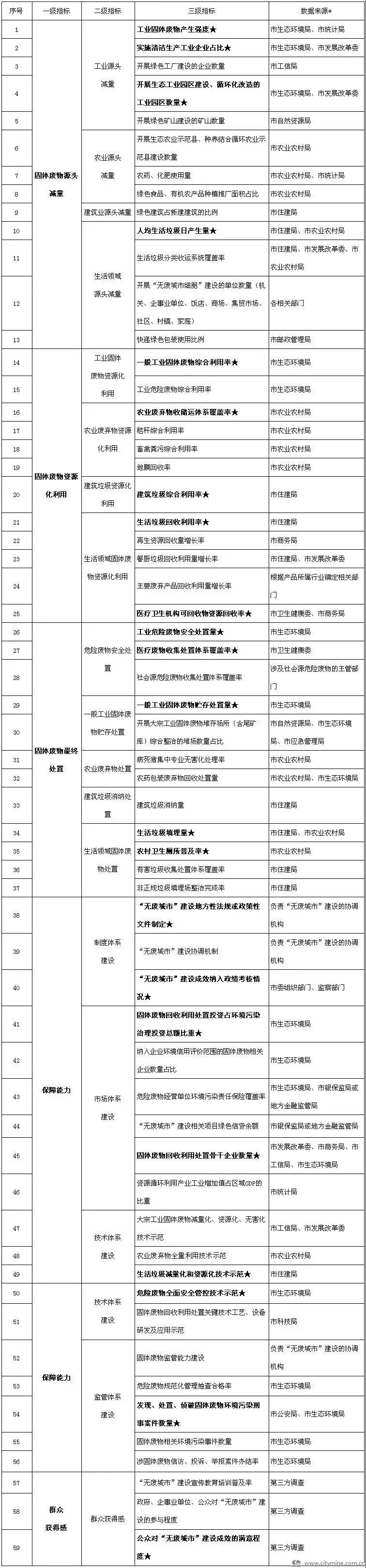 《指标体系》由一级指标、二级指标和三级指标组成,其中一级指标5个、二级指标18个、三级指标59个(具体见表1)。三级指标分为3类:第1类(标注★)为必选指标,共22项,是所有试点城市均需开展调查的指标;第2类为可选指标,共37项,试点城市结合城市类型、特点及试点任务安排选择对应指标;第3类为自选指标,由试点城市结合自身发展定位、发展阶段、资源禀赋、产业结构、经济技术基础等差异性自行设置,为完善我国固体废物统计制度提供支撑。各项指标数据主要来源于现有统计调查数据,或专项调查数据,用于反映城市试点建设成效和发展趋势。试点城市应结合自身城市发展定位、试点建设实际需求等,科学设定各项指标于2020年达到的目标值,但不应低于国家、所在省(区、市)的要求。