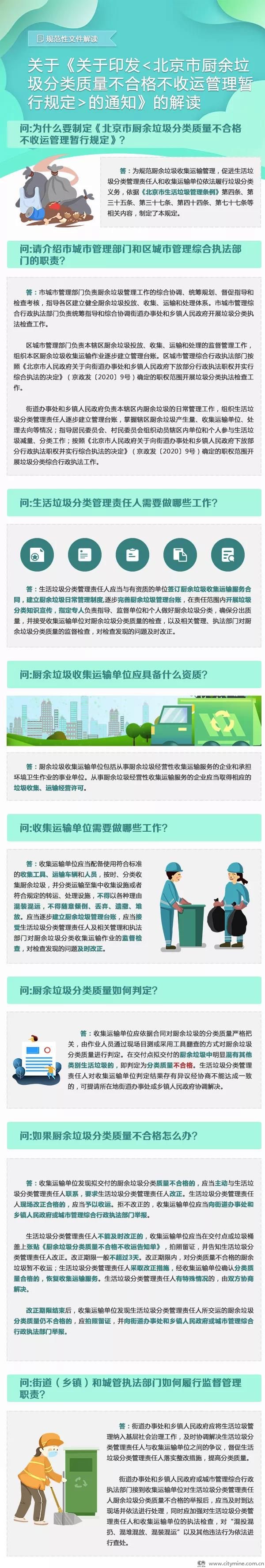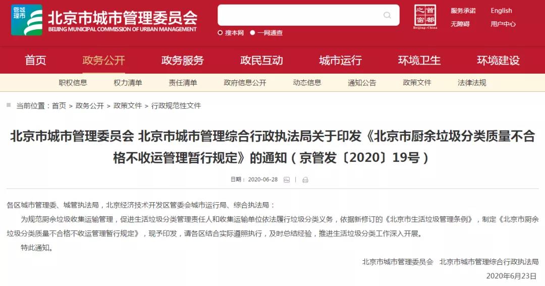 为规范厨余垃圾收集运输管理,促进生活垃圾分类管理责任人和收集运输单位依法履行垃圾分类义务,北京市城市管理委员会 北京市城市管理综合行政执法局关于印发《北京市厨余垃圾分类质量不合格不收运管理暂行规定》的通知: