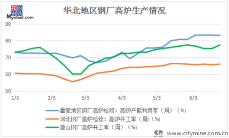 晋蒙地区高炉开工率4月开始震荡上行,至本周除前期检修高炉外,无新增检修,设备基本正产排产,6月整体维持高位稳定,且高炉产能利用率水平在华北区域处于相对高位。