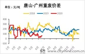 图二:2018-2020年张家港、唐山与广州市场重废价差(不含税,单位:元/吨)