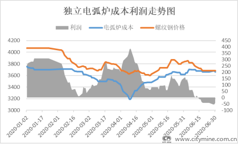 废钢作为电弧炉企业主要的生产原料,废钢价格基本决定了电弧炉生产成本。随着近两年电弧炉产能置换和增加,导致废钢需求大幅提升,废钢价格大幅上涨。2020年上半年电弧炉生产利润较为微薄,主要由于华南地区电弧炉钢厂较多,废钢抢货严重,导致价格一直处于高位,电弧炉成本也一直处于高位。6月份以来,螺纹钢价格震荡下跌,而废钢价格保持坚挺,多数电弧炉钢厂亏损,钢厂多选择减少生产时间,利用晚上谷电生产,个别技术先进的电炉谷电生产仍有30-50元/吨利润。