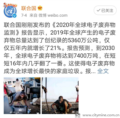 近日联合国微博端发布消息称,新一版《2020年全球电子废弃物监测》报告显示,2019年全球产生的电子废弃物总量达到了创纪录的5360万公吨。并预计2030年这个数据将达到7400万吨。电子废弃物成为全球增长最快的家庭垃圾。