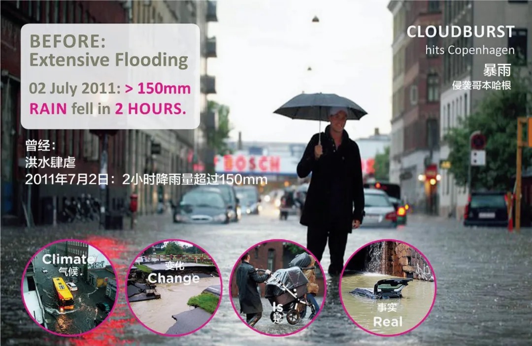 据悉,2010年8月与2011年8月,哥本哈根市在两年内接连遭受了三次毁灭性的暴雨袭击。在这些暴雨事件中,哥本哈根不可计数的高速公路、主干道、列车轨道和其他基础设施被淹没在洪水中,同样被淹的还有大量的商店与住宅。这三次特大暴雨所造成的经济损失累计达到80亿元人民币。