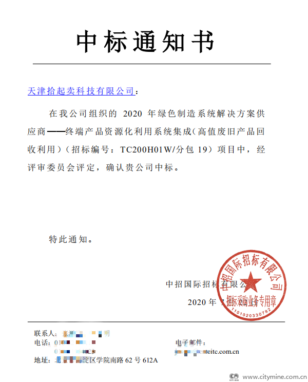 2020年07月31日2020年7月29日,国家工业和信息化部发布了2020年绿色制造系统解决方案供应商中标公告,天津拾起卖科技有限公司在数百家投标企业中脱颖而出,成功中标“终端产品资源化利用系统集成(高值废旧产品回收利用)”项目。