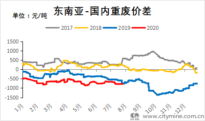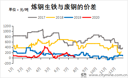 2017年1月~2020年7月生铁与废钢价差走势图(单位:元/吨)