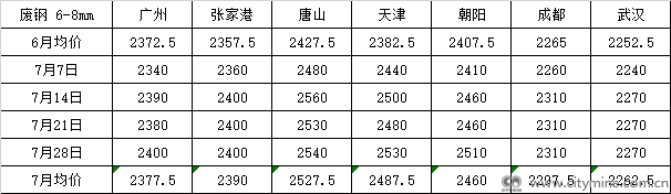 7月全国废钢市场震荡上行。7月高温天气降临,工业废钢产出量有所减少,同时高温对运输造成了一定影响。再加上7月份南方洪涝灾害严重,废钢采购难度加大,钢厂废钢到货情况一般,频频拉涨,同时螺纹钢及铁矿石价格都对废钢市场形成一定支撑,废钢短期将继续保持高位运行。