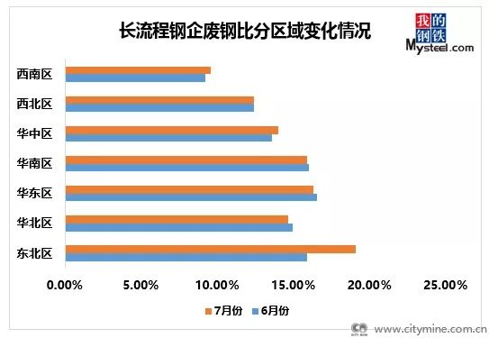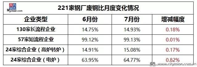 Mysteel调研:7月份长、短流程钢厂废钢比月度变化情况