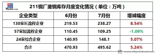 截止7月31日,Mysteel调研的211家长短流程钢厂废钢库存总量在495.62万吨,较上月增加24.69万吨,日消耗总量在46.37万吨,较上月增2.57万吨,平均可用天数在9.86天,较上月减少0.1天。