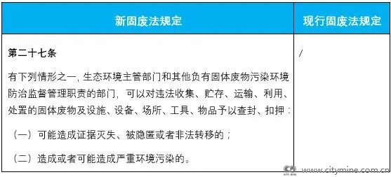 4.明确了对违法收集、贮存、运输、利用、处置的固体废物及设施、设备、场所、工具、物品予以查封、扣押的规定。