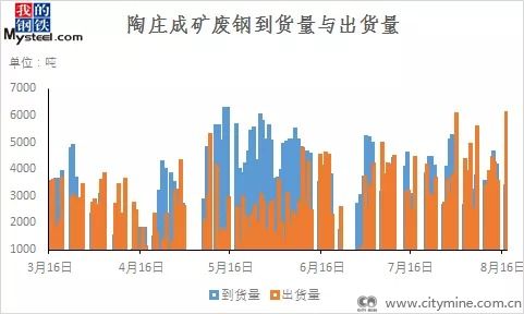 截止18日,8月陶庄成矿日均到货量3473吨,月环比下降14%;8月日均出货量4257吨,月环比下降14.5%。从图3中可以明显看出贸易商近期出货量高于到货量,部分贸易商由于环保因素,清理场地,加快出货,更多贸易商表示,近两个月以来,废钢市场小幅盘整,起伏不大,加之近期废钢市场活跃,抢货严重,受资金面的影响,降低库存,快进快出,加快资金流动。