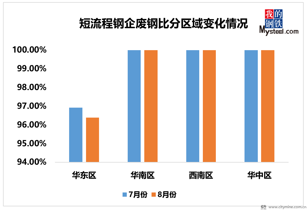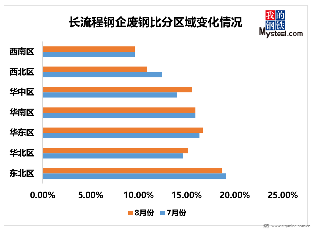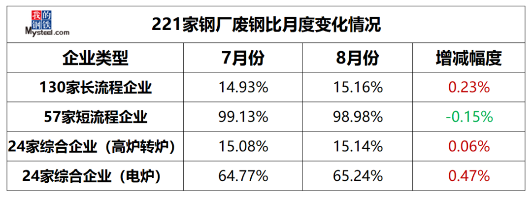 Mysteel调研:8月份长、短流程钢厂废钢比月度变化情况