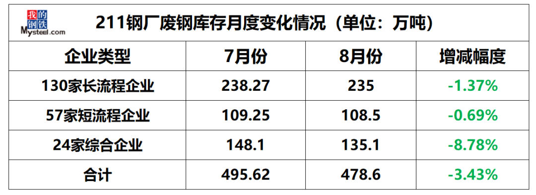 截止8月31日,Mysteel调研的211家长短流程钢厂废钢库存总量在478.6万吨,较上月减少17.02万吨,日消耗总量在46.29万吨,较上月减0.07万吨,平均可用天数在9.24天,较上月减0.62天。