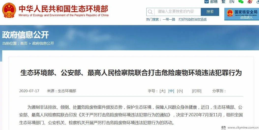 2020年09月22日据悉,最高人民检察院、公安部、生态环境部联合印发《关于严厉打击危险废物环境违法犯罪行为的通知》(以下简称《通知》),组织全国检察机关、公安机关、生态环境部门于2020年7月至11月开展严厉打击危险废物环境违法犯罪行为的活动。