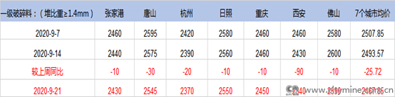 表1:全国主要城市一级破碎料价格变化情况