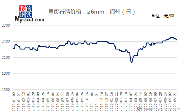 2020年09月30日2020年福建废钢市场受公共卫生事件影响,全年价格走势呈现先抑后扬状态。第一季度基本处于有价无市,物流闭塞情况下基本无成交,供货商节前库存继续积累;自第二季度4月份起,市场秩序逐步恢复,供货商出于恐慌情绪于开市初期大量抛售库存,踩踏性下跌导致价格跌入全年谷底,随着社会库存的下降,供应紧缺状况凸显,废钢价格自4月底5月初止跌回涨,保持偏强态势运行;第三季度“淡季不淡”效应显现,7-8月钢厂废钢需求强劲,市场供应紧张,价格持续上涨到达年内峰值并保持高位坚挺,废钢消耗于9月突破往年峰值。国庆节即将来临,“金九”行情旺季不旺已成事实,“银十”废钢价格将有如何表现,小编将从一下几点进行简单分析。