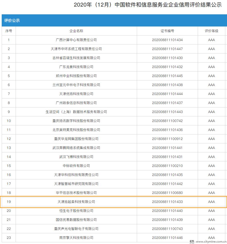 2021年01月04日12月25日,中国软件行业协会公布了“2020年(12月)中国软件和信息服务业企业信用评价结果”,天津拾起卖科技有限公司获评为中国软件和信息服务业AAA级企业。