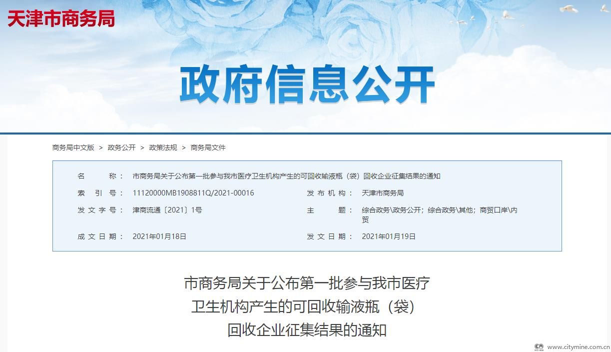 按照市卫生健康委等12部门《关于印发天津市医疗卫生机构废弃物综合治理实施方案的通知》(津卫规后〔2020〕451号)关于做好我市输液瓶(袋)回收企业确定工作的要求,市商务局印发《关于征集参与我市医疗卫生机构产生的可回收输液瓶(袋)回收企业的通知》(津商流通〔2020〕21号),并启动了我市医疗卫生机构产生的可回收输液瓶(袋)回收企业征集工作。