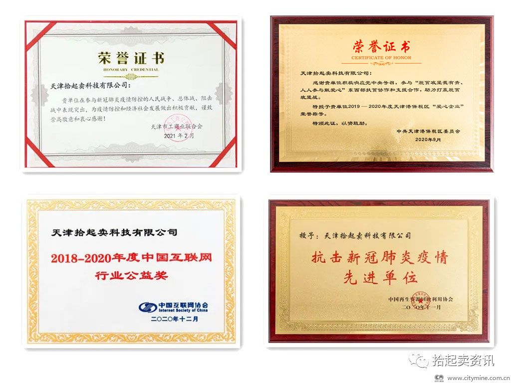 为激励社会力量在服务群众、服务社会、服务国家中担当作为,表彰先进典型的示范引领,此前天津市工商业联合会、中共天津港保税区委员会、中国再生资源回收利用协会以及中国互联网协会对拾起卖疫情期间积极参与疫情防控,助推企业复工复产和助力打赢脱贫攻坚战等方面的突出成绩进行了表彰。