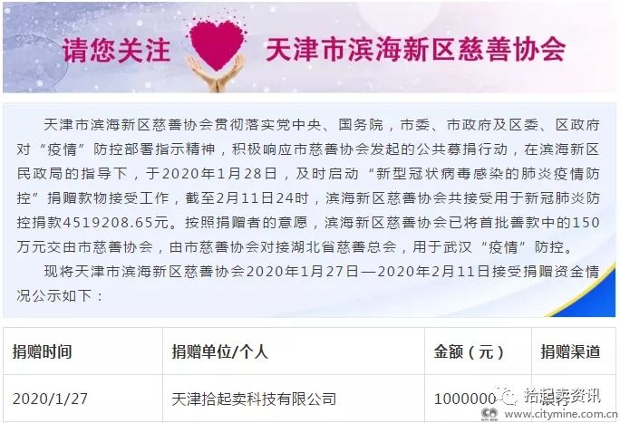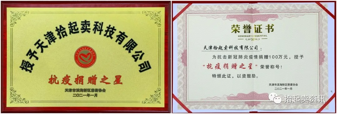 常怀感恩之心,倾力回报社会。2020年初疫情爆发,拾起卖第一时间做出反应,向天津市滨海新区慈善协会捐款100万元,用以支持新型冠状病毒肺炎疫情防控工作,此笔捐款也是滨海新区慈善协会本次疫情收到的第一笔善款。
