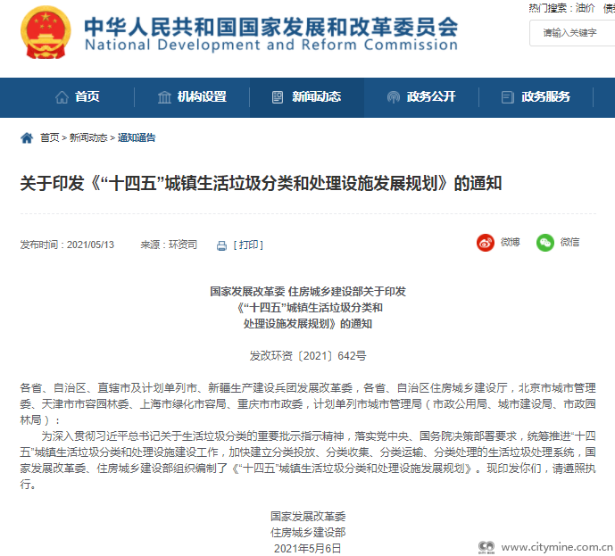 原标题:5月13日,发改委印发 《“十四五”城镇生活垃圾分类和处理设施发展规划》通知