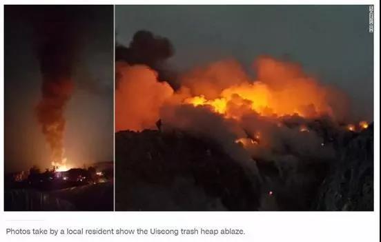 (图为义城郡的巨大垃圾山,注意与左下角的房屋作对比 图源:CNN)
