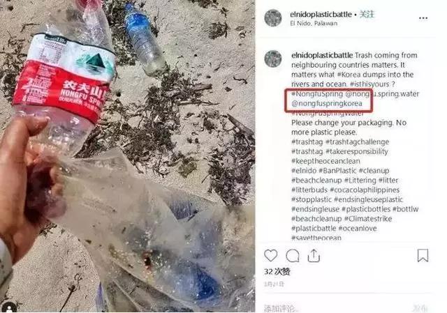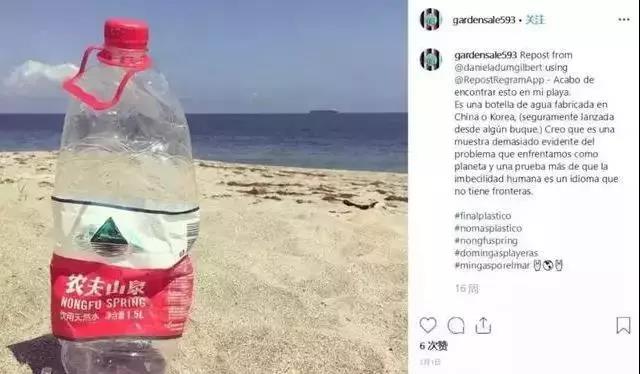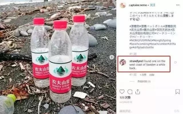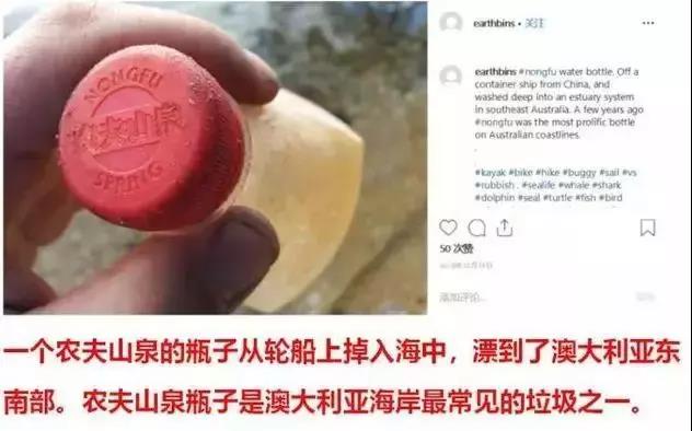 Instagram上一名叫earthbins,专门拍摄和捡拾澳大利亚海滩上的垃圾。在他的帖子里,农夫山泉不仅是最常出现的瓶子,而且是最常出现的品牌。海滩垃圾的江湖谱上,比起农夫山泉,连可口可乐都只能屈居第二