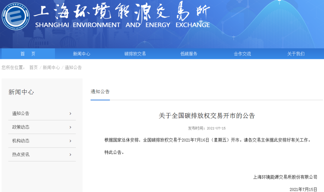 全国碳排放权交易于7月16日开市。7月15日,上海环境能源交易所发布关于全国碳排放权交易开市的公告,全国碳排放权交易于2021年7月16日(星期五)开市。