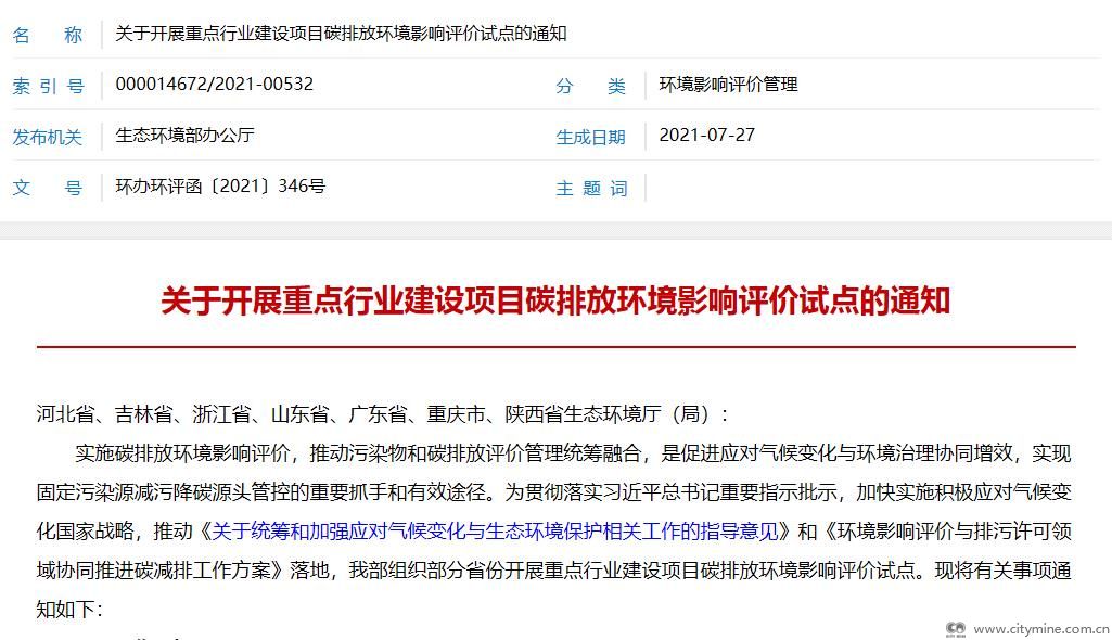 生态环境部:将开展重点行业建设项目碳排放环境影响评价试点