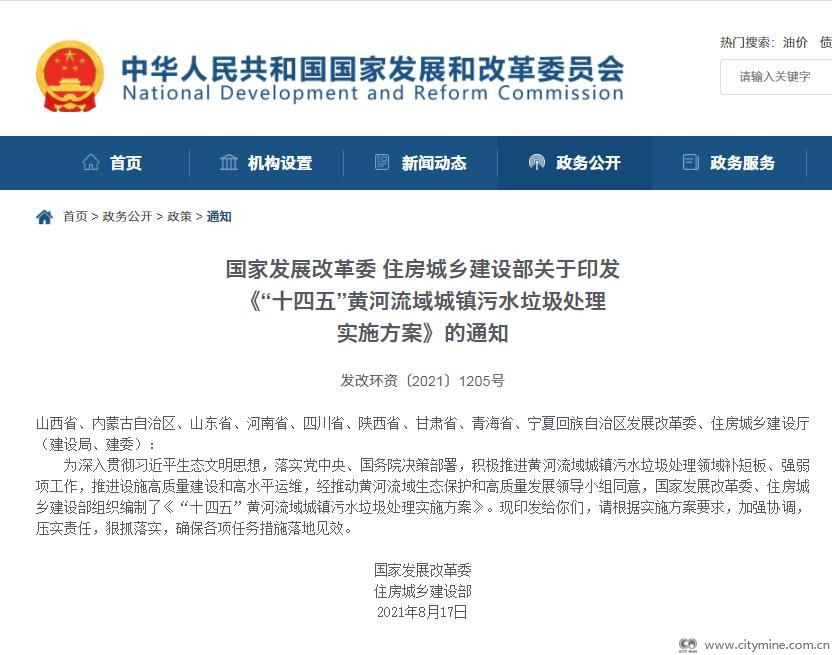 《“十四五”黄河流域城镇污水垃圾处理实施方案》印发