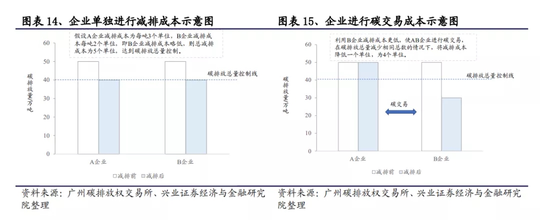 碳交易市场是由政府通过对能耗企业的控制排放而人为制造的市场。通常情况下,政府确定一个碳排放总额,并根据一定规则将碳排放配额分配至企业。如果未来企业排放高于配额,需要到市场上购买配额。与此同时,部分企业通过采用节能减排技术,最终碳排放低于其获得的配额,则可以通过碳交易市场出售多余配额。双方一般通过碳排放交易所进行交易。