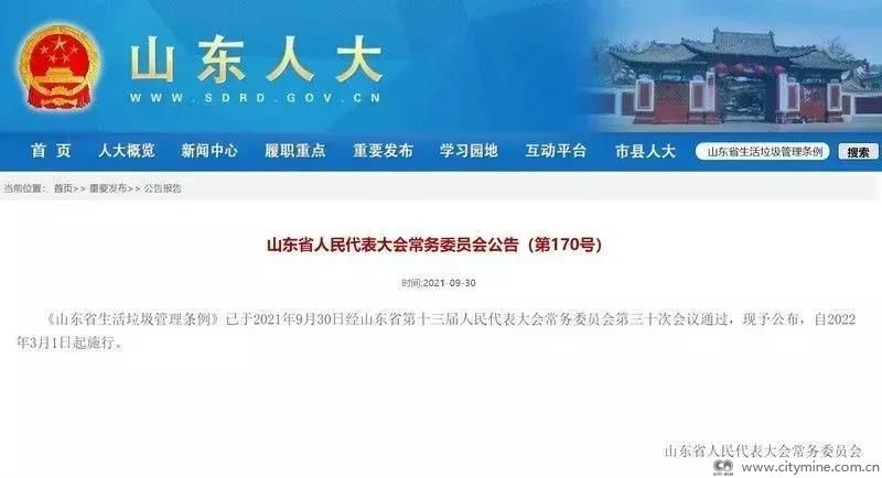 2021年10月12日《山东省生活垃圾管理条例》于9月30日经省十三届人大常委会第三十次会议审议通过,将于2022年3月1日起施行。