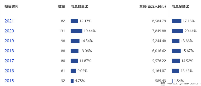 分年来看,政府产业引导基金直投绿色项目数量与金额逐年走高,尤其是2016年之后,进入快速发展期,在投资次数上超过了60次,规模上超过500亿元。2020年再次大幅提高,投资次数达到131次,金额达到78.50亿元。