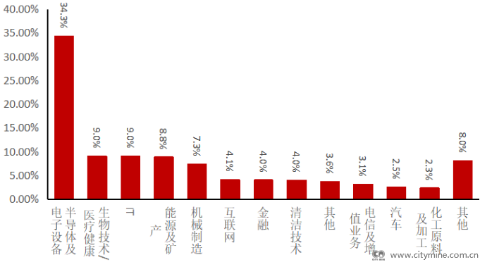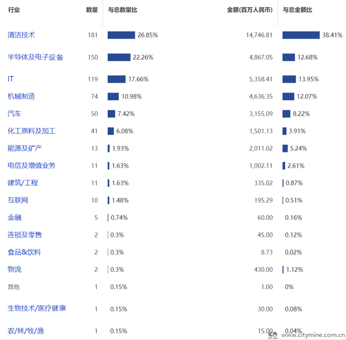 从直投项目来看,按关键词检索的数据显示,清洁技术行业在数量与投资金额均占比最高,分别为26.85%和38.41%,其次为半导体与电子设备行业,数量与投资规模占比分别为22.26%与12.68%。之后依次是IT行业、机械制造行业、汽车行业等。