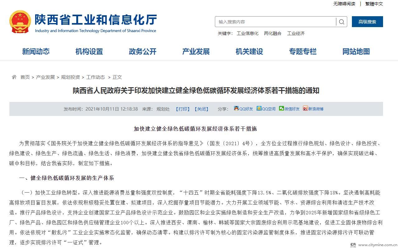 2021年10月18日近日,陕西省人民政府关于印发加快建立健全绿色低碳循环发展经济体系若干措施的通知(陕政发〔2021〕15号),要求健全绿色低碳循环发展的生产体系,健全绿色低碳循环发展的流通体系,健全绿色低碳循环发展的消费体系,加快基础设施绿色升级,加快基础设施绿色升级,完善政策支持和法制保障体系。