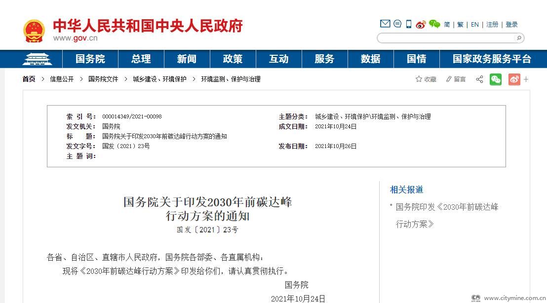 2021年10月27日国务院关于印发2030年前碳达峰行动方案的通知