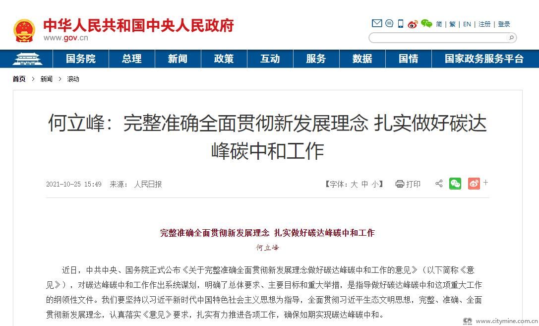 近日,中共中央、国务院正式公布《关于完整准确全面贯彻新发展理念做好碳达峰碳中和工作的意见》(以下简称《意见》),对碳达峰碳中和工作作出系统谋划,明确了总体要求、主要目标和重大举措,是指导做好碳达峰碳中和这项重大工作的纲领性文件。我们要坚持以习近平新时代中国特色社会主义思想为指导,全面贯彻习近平生态文明思想,完整、准确、全面贯彻新发展理念,认真落实《意见》要求,扎实有力推进各项工作,确保如期实现碳达峰碳中和。