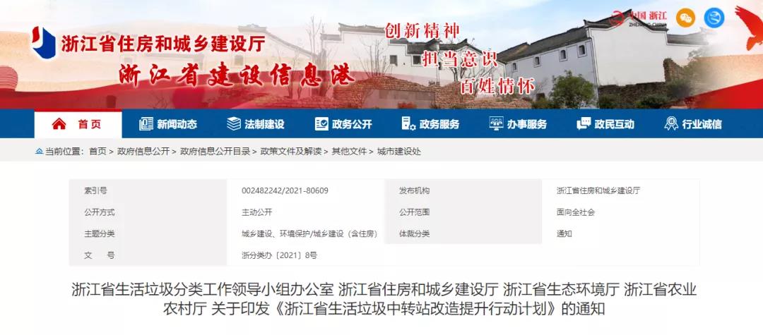 浙江省发布《浙江省生活垃圾中转站改造提升行动计划》