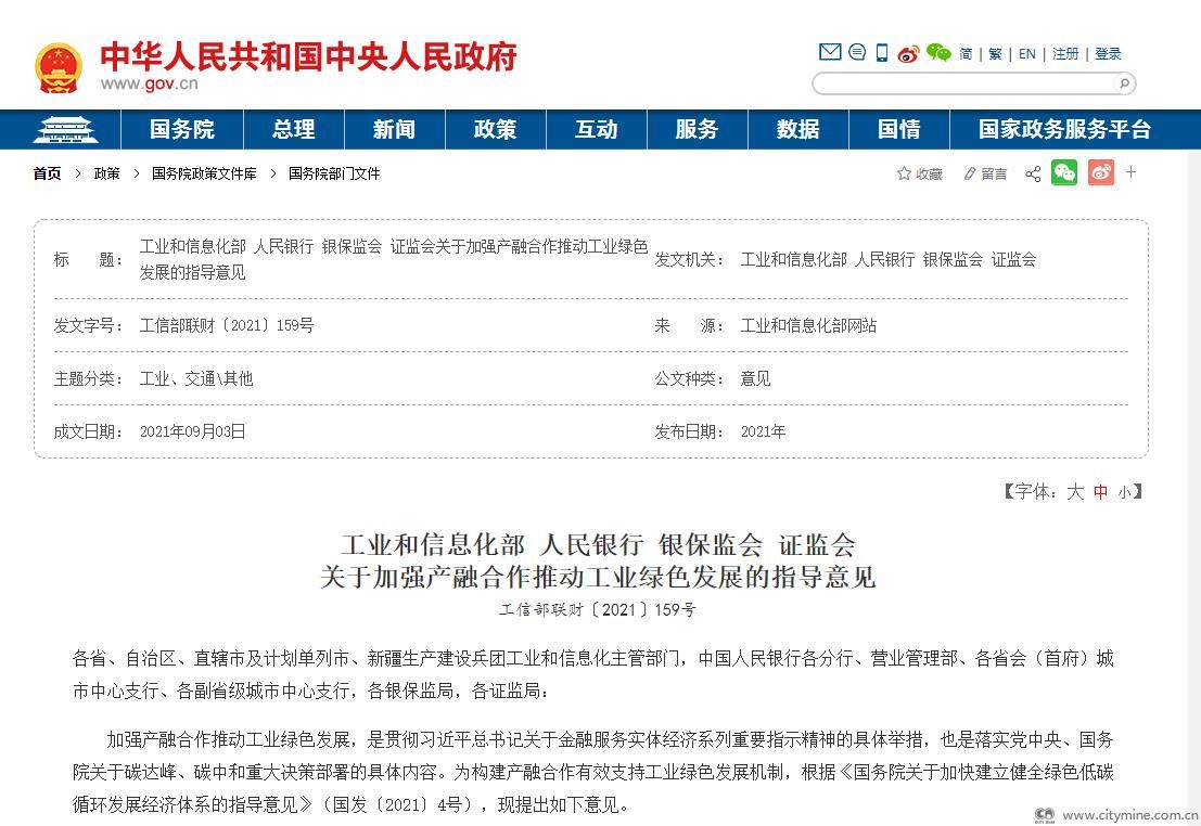 四部门联合发布《关于加强产融合作推动工业绿色发展的指导意见》