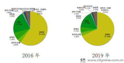 △ 图片图片图2 2016年和2019年再生资源回收量结构变化(资料来源:商务部、HGFR)