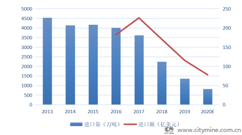 随着禁止进口固体废物的方案深入实施,中国固体废物进口量大幅度下降中国。从2017年7月开始,中国开始逐步实施禁止进口洋垃圾的政策,从数据上体现的非常明显,以五大类别(废钢铁、废有色金属、废塑料、废纸、废旧纺织品)总量来看,2017年之前,再生资源的进口量是比较稳定的,2017年开始快速下降,预测2020年大约进口800万吨左右。根据2019年的增长率和海关数据推测,不到2013年的18%。进口额也快速下降。
