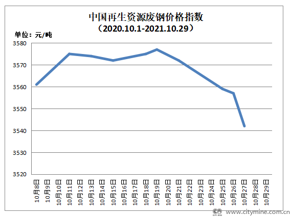 10月废钢市场呈现震荡先涨后跌走势运行。截至2021年10月27日,中国再生资源全国重废市场均价为3404.25元/吨,较上期均价上涨30.85元/吨,涨幅0.9%,较去年同期上涨943.97元/吨,同比涨幅为38.37%。协会统计目前河北唐山8厚重废3660-3770元/吨,山东聊城冲花料主流3590元/吨,张家港重废3450-3500元/吨,浙江嘉兴冲花料3400-3420元/吨,广东冲花料3270-3330元/吨。
