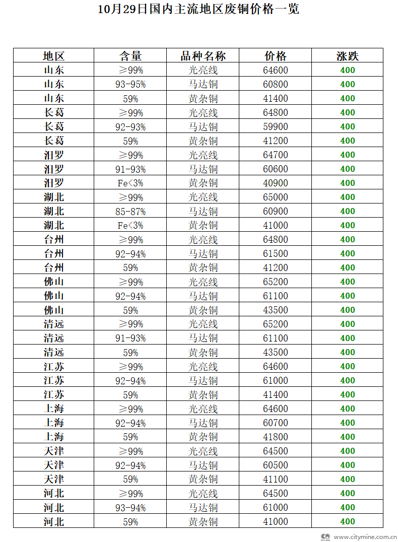 10月废铜价格刷新5月中旬后高点,表现为冲高回落,精废价差拉开,铜杆销量转好。10月27日河北地区光亮铜贸易商回收价格为65100元/吨,较上期上涨1400元/吨;广东地区光亮铜价格为65600元/吨,较上期上调1400元/吨;而天津、河北地区铜厂收购报价为65200元/吨,较上期价格上涨1300元/吨。再生铜市场10月成交情况明显高于9月,且开工情况限制影响减少。首先10月废铜价格受铜价上涨影响,原料端利润空间放大,持货商出货情绪高涨,而且伴随价格走高,精废价差直接拉开至2000元/吨以上,据山东、江苏、安徽等地铜厂反馈,自价格冲高后低氧杆需求明显增加,排除中间商看涨倒手获利因素,主要原因还是用低氧杆成本更低,其青睐度明显上升。而区域性的减产情况也随着电力成本的降低和错峰生产等措施生效,河北、天津和辽宁等地已恢复正常生产,但江西地区开工对比上月略有回落,因为小厂限制性生产因素增多,预计下月将恢复正常产能。根据当前影响因素分析,中再生协会预计,废铜价格走势因其被动涨跌特性,存在跟盘下调风险,后市仍需关注铜价涨跌和与生产有关等因素。