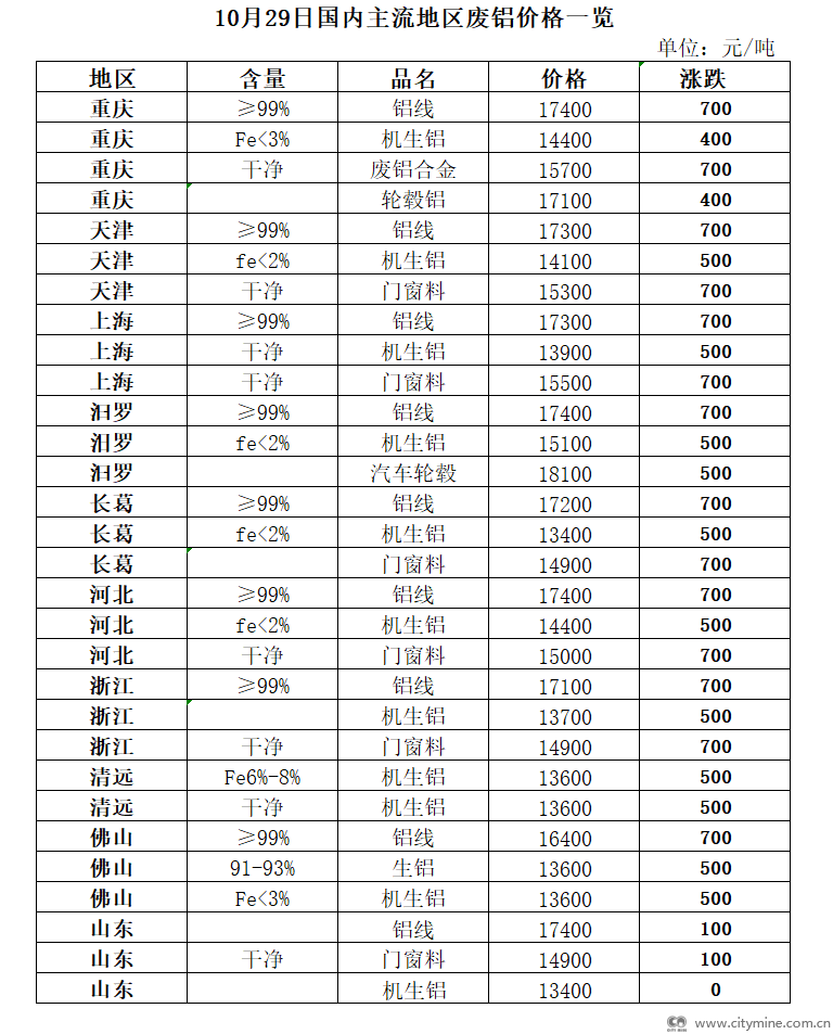 截至10月27日,10月份废铝价持续上涨为主,累计降600-1600元/吨。铝亮线下跌1600元/吨至18300元/吨,降幅8.04%;废合金方面:废铝合金门窗料降1600元/吨至15800元/吨,降幅9.20%。废生铝方面:废汽车轮毂降600元/吨至18900元/吨,降幅3.08%。废机件生铝(汽车)本期降1600元/吨至14400元/吨,降幅10%。10月份影响废铝价格波动的主要因素有:废铝价格先涨后跌,10月中上旬仍受到铝价上涨的带动,加之资源偏紧张,价格持续上涨为主;月度末铝价下滑,废铝受到价格的冲击,价格也跟随不断下滑。生铝下降更为明显,主要是硅价下跌,使得高位生铝需求偏弱。协会预计下月废铝价格小幅回调为主。