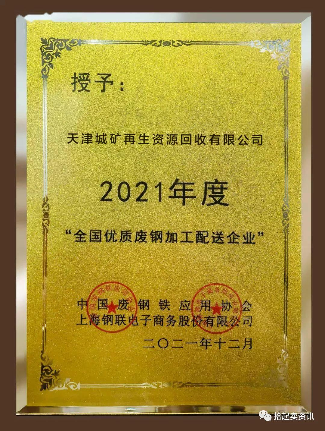 原标题:【2021废钢铁大会】拾起卖旗下天津城矿再生资源回收有限公司三获“全国优质废钢加工配送企业”称号