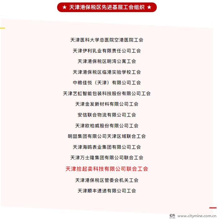 2021年12月31日近日,天津港保税区总工会公布了《关于表彰2020-2021年度天津港保税区先进基层工会组织、模范工会主席、优秀工会干部的决定》,天津拾起卖科技有限公司联合工会荣获“2020-2021年度天津港保税区先进基层工会组织”荣誉称号。