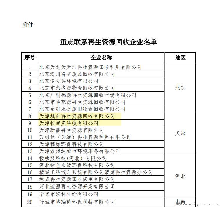 拾起卖、天津城矿等企业被商务部列为重点联系再生资源回收企业