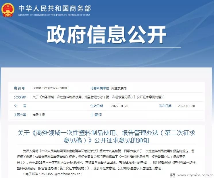 2022年01月26日2022年1月20日,为深入贯彻《中华人民共和国固体废物污染环境防治法》第六十九条和第一百零六条关于一次性塑料制品使用和报告的规定,督促相关市场主体遵守国家禁塑限塑有关规定,我们会同有关部门研究起草了《一次性塑料制品使用、报告管理办法(征求意见稿)》,并于2021年三季度向社会公开征求意见。在综合考虑各方面因素、吸收各方意见的基础上,我们修改形成《商务领域一次性塑料制品使用、报告管理办法(第二次征求意见稿)》,现公开征求意见。 意见反馈截止日期为2022年1月26日。