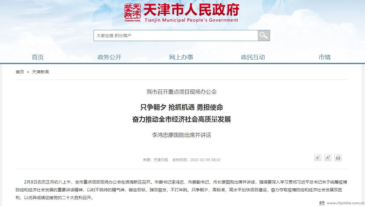 2022年02月09日2月8日农历正月初八上午,全市重点项目现场办公会在滨海新区召开。市委书记李鸿忠,市委副书记、市长廖国勋出席并讲话,强调要深入学习贯彻习近平总书记关于统筹疫情防控和经济社会发展的重要讲话精神,以时不我待的精气神,锚定目标、踔厉奋发,不打年盹、只争朝夕,高标准、高水平加快项目建设,奋力夺取疫情防控和经济社会发展双胜利,以优异成绩迎接党的二十大胜利召开。