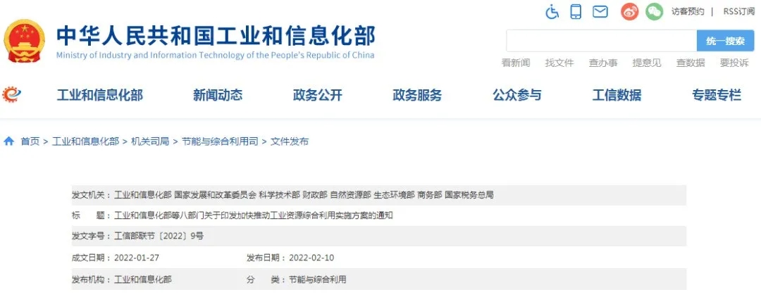 2022年02月11日2月10日,工信部等八部门联合印发《关于加快推动工业资源综合利用的实施方案》。方案提出,目标到2025年,钢铁、有色、化工等重点行业工业固废产生强度下降,大宗工业固废的综合利用水平显著提升,再生资源行业持续健康发展,工业资源综合利用效率明显提升。力争大宗工业固废综合利用率达到57%,其中,冶炼渣达到73%,工业副产石膏达到73%,赤泥综合利用水平有效提高。主要再生资源品种利用量超过4.8亿吨,其中废钢铁3.2亿吨,废有色金属2000万吨,废纸6000万吨。