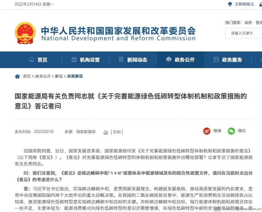 2022年02月14日经国务院同意,近日,国家发展改革委、国家能源局印发《关于完善能源绿色低碳转型体制机制和政策措施的意见》(以下简称《意见》)。《意见》对完善能源绿色低碳转型的体制机制和政策措施作出哪些部署?记者专访了国家能源局有关负责同志。